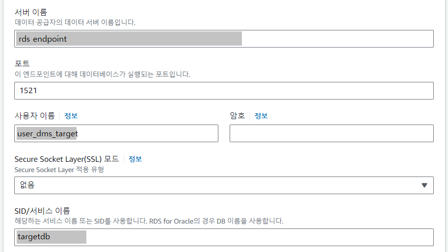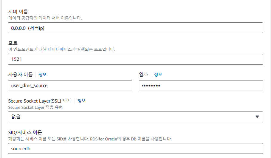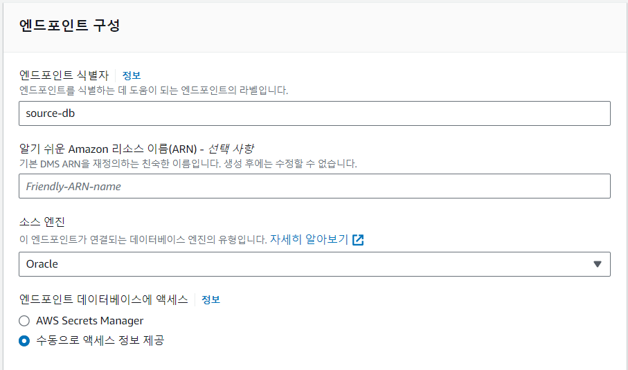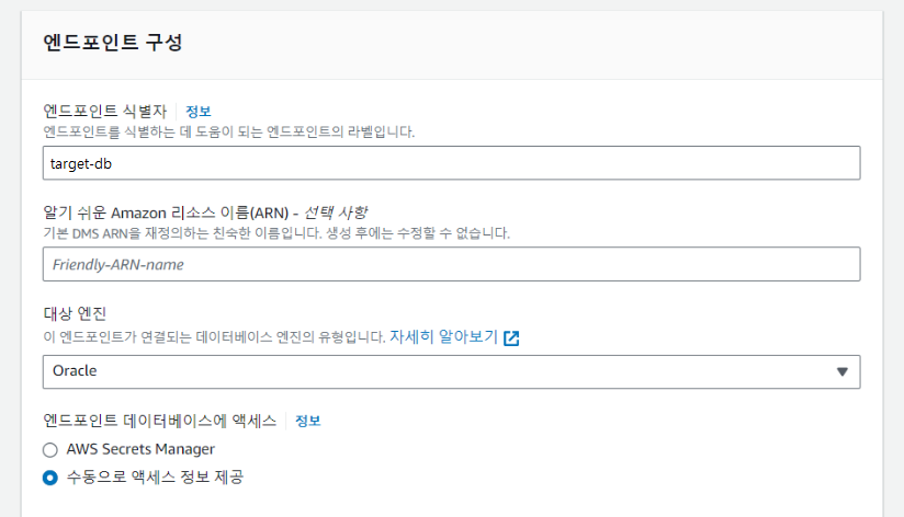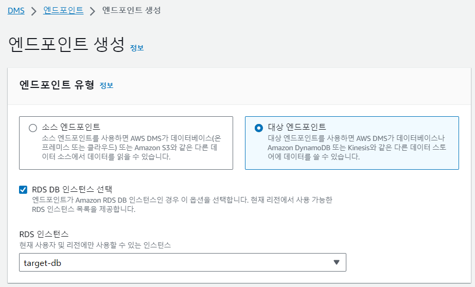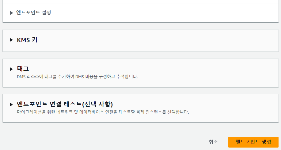 AWS 콘솔 > Database Migration Service > 데이터 마이그레이션 > 엔드포인트 > 엔드포인트 생성