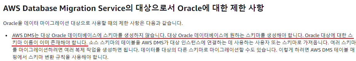 AWS DMS는 대상 Oracle 데이터베이스에 스키마를 생성하지 않습니다. 대상 Oracle 데이터베이스에 원하는 스키마를 생성해야 합니다. Oracle 대상에 대한 스키마 이름이 이미 존재해야 합니다.