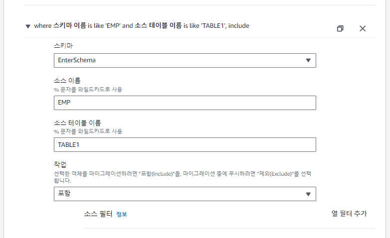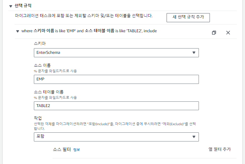 3. 타겟 데이터베이스에 대상 스키마 생성 단계에서 생성한 EMP 스키마에 테이블이 생성되도록 변환 규칙을 추가한다.
