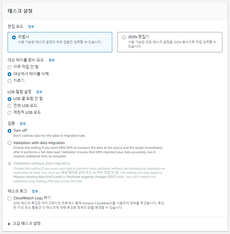 AWS 콘솔 > Database Migration Service > 데이터 마이그레이션 > 데이터베이스 마이그레이션 태스크 > 태스크 생성