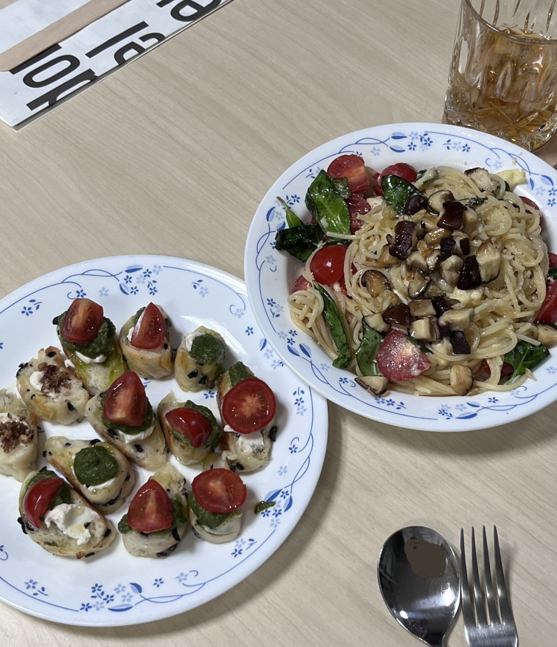 베이글을 잘게 자르고 그 위에 크림치즈와 바질페스토와 토마토를 올린 후 올리브오일을 살짝 뿌려 먹었다! 오른쪽은 브리치즈파스타. 브리치즈에서 꿉꿉한 맛이 나서(치즈를 완전히 녹이지 않았기 때문이었다) 조금 갸우뚱 했지만 싹싹 긁어먹긴 했다. 레시피에 없던 표고버섯이 신의 한수였다. 두 음식이 들어간건 비슷하지만 서로 다른 느낌이어서 재밌게 먹었다.